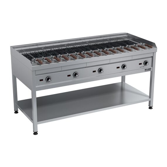 1600х700х850мм, Напольная электрическая шашлычница из нержавеющей стали с 5-ю зонами нагрева. Особенность этой шашлычницы – наличие лавовых камней, долго держащих тепло и выполняющих роль раскаленных углей. Капли жира, попадая на камни, образуют лёгкий дымок, придающий мясу неповторимый вкус. Добавив на камни немного древесной стружки, вы получите продукт с тонким ароматом копчения. Шампура из нержавеющей стали имеют удобную деревянную ручку и специальную геометрию для фиксации их в разных положениях, 5х5,4кВт, 380В, Брутто: 208кг