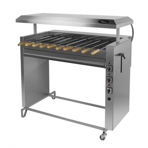 1200x610x900 мм, 10 шампуров, подъемная крыша, регулирующая уровень тепловой обработки продукта, автоматическое вращение шампуров, колеса со стопорами, полностью из нержавеющей стали, 380В