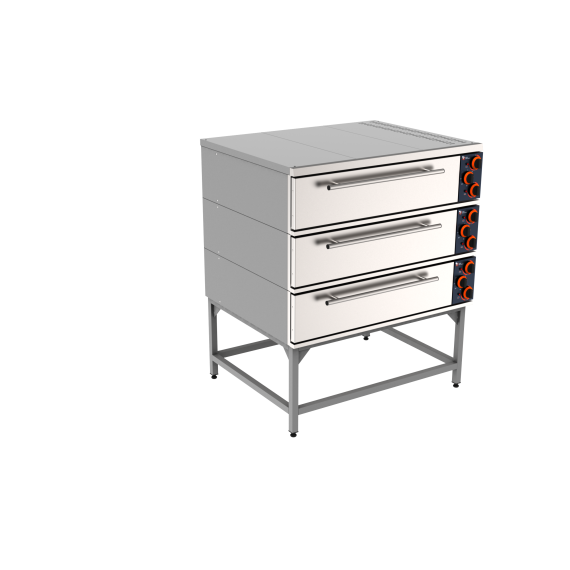 Пекарный шкаф ШПЭ-3, трёхсекционный, 3х-уровневая регулировка мощности верхних и нижних нагревателей в каждой камере, регулятор температуры; мощность - 15,6 кВт. Шкаф пекарный имеет модульную конструкцию в виде подставки, 3х секций духового шкафа и крышки (поставляется в собраном виде). Подставка выполнена из профильных элементов конструкц. стали толщиной 1,5 мм. , ножки из профильной трубы 40х40 и окрашена порошковой краской серого цвета. Лицевая панель выполнена из нерж стали марки AISI 430 толщиной 1,2 мм. Задняя и боковые панели, а так же крышка выполнены из конструкц. стали толщиной 1 мм окрашенной порошковой краской серого цвета. В комплекте 2 противня на секцию. Масса шкафа 280кг. Внутренние размеры духового шкафа: 1000х800х180, мм. Габаритные размеры шкафа:1300х1020х1550,мм.