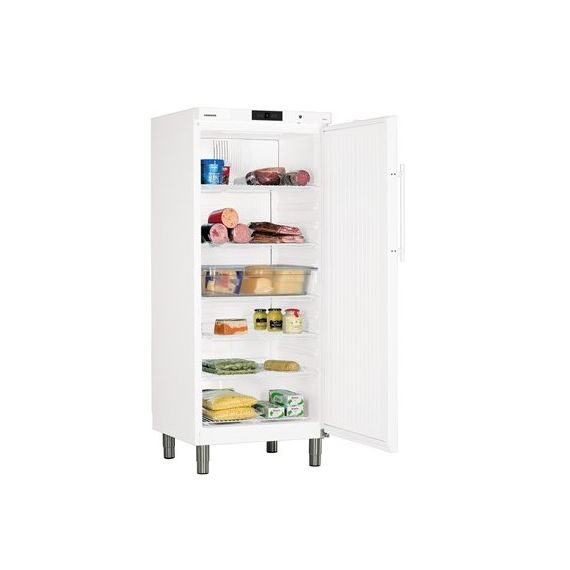 Шкаф холодильный, производства LIEBHERR (Германия) модель GKv 5730, предназначен для охлаждения и кратковременного хранения различных продуктов питания.Вместительная холодильная камера выполнена из белого пластика, обладает общим объёмом 583 л. Для уменьшения теплопотерь камера оснащена изоляцией толщиной 50 мм. Внутренние размеры камеры составляют (мм): 650 (ширина), 581 (глубина), 1510 (высота). Для размещения продуктов камера оснащена 6 оцинкованными решетками, пять из них регулируемые. Загрузочная емкость холодильного отделения составляет 60 кг. Холодильная камера легко чистится, её материал имеет антикоррозийные свойства. Данная модель позволяет хранить продукты при температурном режиме -2..+15 °C. Для хранения продуктов применяется вентилируемый тип охлаждения. При охлаждении продуктов используется хладагент R600a. Размораживание холодильной камеры выполняется в автоматическом режиме. Данная модель шкафа имеет климатический класс SN-ST.Корпус холодильного шкафа выполнен из качественной стали и окрашен в