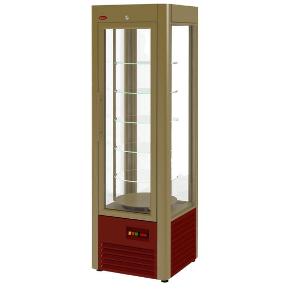 600х600х1930мм, t режим +1…+10 C, 5 стеклянных полок, 1 металлическая полка, полезный объем —0,22 м3, охлаждаемая площадь поддонов для выкладки продуктов 1,1 м2, динамическое охлаждение, раздвижные задние шторки, оттайка ТЭН, потр. эл.энергии в сутки —4,5кВт, R290, цвет корпуса — золотой, экспозиционные поверхности — отделка под золото, 220В.