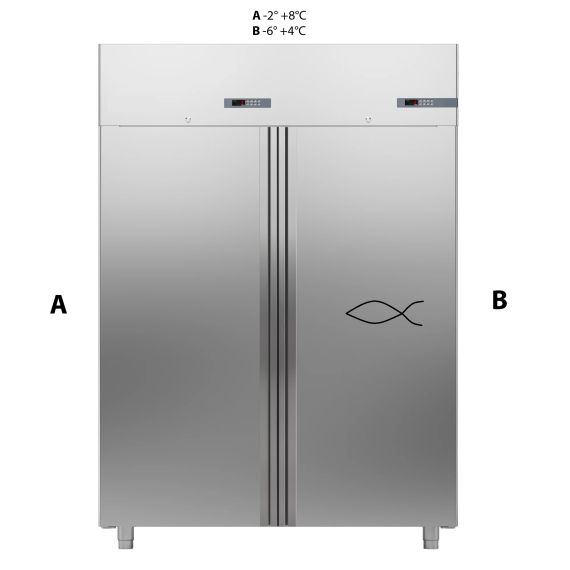 1480х815х2085 мм, 240 кг, 0,48 кВт, 220 В, 1400 литров, от -2 до +8С, от -6 до +4С, энергетический класс С, нерж сталь AISI 304, толщина изоляции 75 мм, подсветка, замок, 2 глухие двери, R290, в комплекте: 3 полки GN2/1, 6 емкостей для рыбы GN1/1, с агрегатом