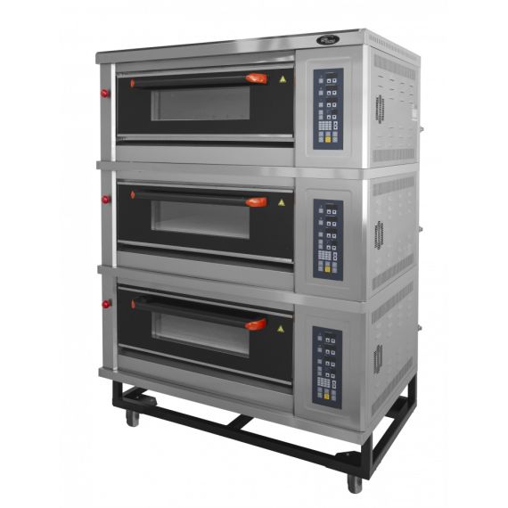 1388х1086х1747 мм, 3 разборные секции на 6 пекарских противиней 600х400 с бойлерным пароувлажнением, про-ть за 1 цикл выпечки - 72 буханки (форма Л7)/42 батона/30 багетов, большая рабочая камера, внутренние габариты каждой секции 870х685х165 мм, выполненная полностью из нержавеющей стали. Электронная система розжига горелок с комплексной системой газ-контроль, 16 программируемых режимов работы, таймер каждой секции,режим отложенного запуска печи, раздельная регулировка температуры свода и пода печи, автоматическое поддержание температуры в пределах 40-300С, шибер каждой секции, яркая подсветка каждой секции, двери секций с большим двойным остеклением из закаленного стекла с подпружиненным возвратным механизмом закрытия. Для работы на природном и баллонном газе. Поставляется на колесах, оснащенными стопорами, газовая мощность 18 кВт + 9 кВт, 220 В, настроен на метан, габаритные размеры нетто 1388х1086х1747 мм, масса 375 кг, брутто 1478х1176х1960 мм, 400 кг