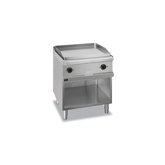 Электрическая открытая сковорода (жарочная поверхность) 700 серии APTE-77PLC предназначена для обжарки мяса, рыбы, котлет и овощей.Столешница, вентиляционная решетка и передняя панель сковороды выполнены из нержавеющей стали AISI 304, боковые и задняя панели - из нержавеющей стали AISI 430. Толщина металла 1 мм.Модель оснащена гладкой хромированной жарочной поверхностью из конструкционной стали, размером 650х570 мм и толщиной 15 мм, с двумя независимыми зонами нагрева. Нагрев производится армированными нагревательными элементами из нержавеющей стали.Для защиты от брызг присутствует борт из нержавеющей стали, толщиной 3 мм.У жарочной поверхности предусмотрен небольшой уклон для облегчения очистки и слива излишков жира в съемный жиросборник из нержавеющей стали, объемом 2 литра.Данная модель укомплектована открытой подставкой с регулируемыми ножками.Данную модель можно использовать как самостоятельно, так и в составе технологической линии.Открытая сковорода работает от сети с напряжением 380В, потребляемая мощн