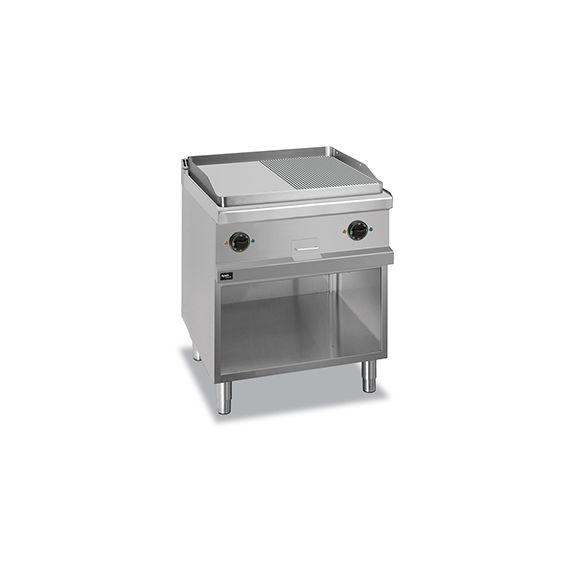Электрическая открытая сковорода (жарочная поверхность) 700 серии APTE-77PLR предназначена для обжарки мяса, рыбы, котлет и овощей.Столешница, вентиляционная решетка и передняя панель сковороды выполнены из нержавеющей стали AISI 304, боковые и задняя панели - из нержавеющей стали AISI 430. Толщина металла 1 мм.Модель оснащена комбинированной (1/2 рифленая, 1/2 гладкая) жарочной поверхностью из конструкционной стали, размером 650х570 мм и толщиной 15 мм, с двумя независимыми зонами нагрева. Нагрев производится армированными нагревательными элементами из нержавеющей стали.Для защиты от брызг присутствует борт из нержавеющей стали, толщиной 3 мм.У жарочной поверхности предусмотрен небольшой уклон для облегчения очистки и слива излишков жира в съемный жиросборник из нержавеющей стали, объемом 2 литра.Данная модель укомплектована открытой подставкой с регулируемыми ножками.Данную модель можно использовать как самостоятельно, так и в составе технологической линии.Открытая сковорода работает от сети с напряжением 3