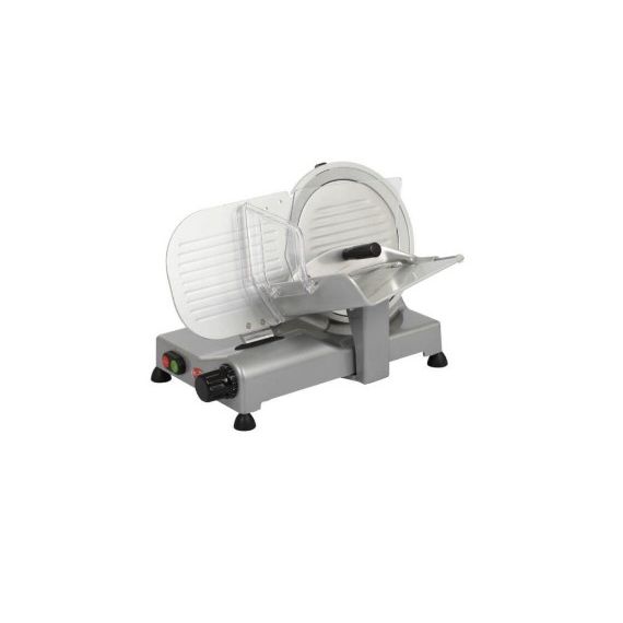 Габариты 530 x 442 x H 320 мм. Диаметр ножа 220 мм, рез 230x160 мм. Полуавтоматический слайсер для нарезки мяса, сыра, колбасных изделий и других продуктов питания. Толщина нарезки 0-14?16 мм. Слайсер для профессионального использования на предприятиях общественного питания. Нож из хромированной стали, корпус из лакированного алюминия с пластиковыми деталями. Съемное заточное устройство.