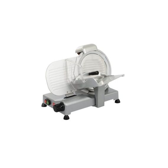 Габариты 530 x 442 x H 345 мм. Версия DOM. Диаметр ножа 250 мм, рез 230x185 мм. Полуавтоматический слайсер для нарезки мяса, сыра, колбасных изделий и других продуктов питания. Толщина нарезки 0-14?16 мм. Слайсер для профессионального использования на предприятиях общественного питания. Нож из хромированной стали, корпус из лакированного алюминия с пластиковыми деталями. Фиксированное заточное устройство.