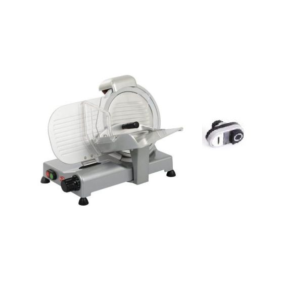 Габариты 530 x 442 x H 345 мм. Диаметр ножа 250 мм, рез 230x185 мм. Полуавтоматический слайсер для нарезки мяса, сыра, колбасных изделий и других продуктов питания. Толщина нарезки 0-14?16 мм. Слайсер для профессионального использования на предприятиях общественного питания. Нож из хромированной стали, корпус из лакированного алюминия с пластиковыми деталями. Фиксированное заточное устройство.