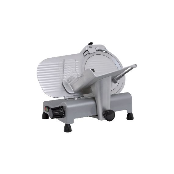 Габариты 605 x 480 x H 420 мм. Версия DOM. Диаметр ножа 300 мм, рез 245x195 мм. Полуавтоматический слайсер для нарезки мяса, сыра, колбасных изделий и других продуктов питания. Толщина нарезки 0-14?16 мм. Слайсер для профессионального использования на предприятиях общественного питания. Нож из хромированной стали, корпус из лакированного алюминия с пластиковыми деталями. Фиксированное заточное устройство.