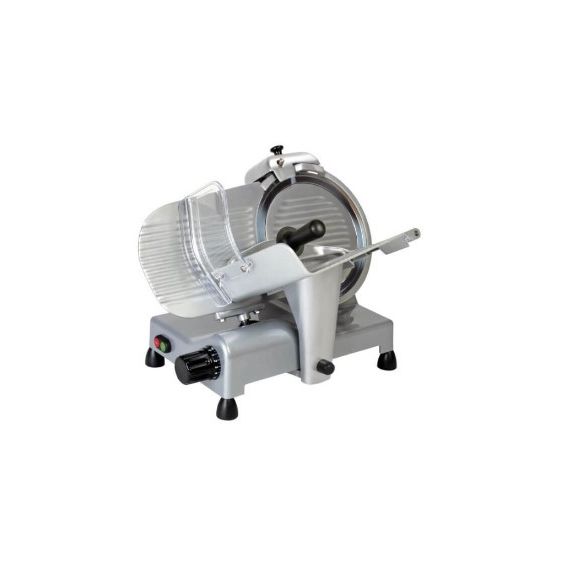 Габариты 605 x 480 x H 420 мм. Диаметр ножа 300 мм, рез 245x195 мм. Полуавтоматический слайсер для нарезки мяса, сыра, колбасных изделий и других продуктов питания. Толщина нарезки 0-14?16 мм. Слайсер для профессионального использования на предприятиях общественного питания. Нож из хромированной стали, корпус из лакированного алюминия с пластиковыми деталями. Фиксированное заточное устройство. Версия PROF CEV