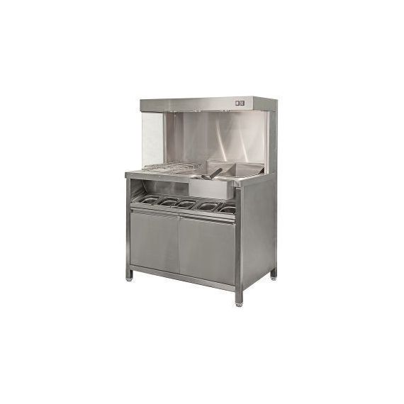 600х900х1500мм, Станция для хранения и фасовки картофеля фри. Конструкция ванны для хранения картофеля имеет конвективный нагрев, что обеспечивает более длительное хранение картофеля по сравнения со статическим нагревом ИК-нагревателями. Станция комплектуется перегородкой, которая позволяет разделить ванну на две части. В нижней части под столешницей расположена ниша для упаковки с возможностью регулировки ширины одной из четырех зон. Большой внутренний объем под ванной обеспечивает возможность складирования каких-либо дополнительных расходных материалов, двери распашные. Для защиты внутреннего объема ванны предусмотрено съемное боковое стеклянное ограждение, которое возможно установить как с правой, так и с левой стороны. Сверху предусмотрена светодиодная подсветка и универсальный кронштейн под фасовочный совок.