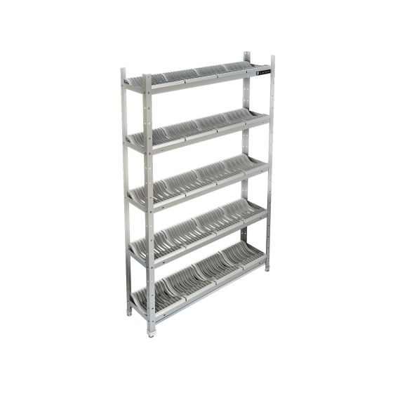 1500х300х1830, разборный, стойки из оцинкованного уголка, 5 полок из стали AISI 430 c кассетами из пластмассы на 325 тар. Поддон из стали AISI 304