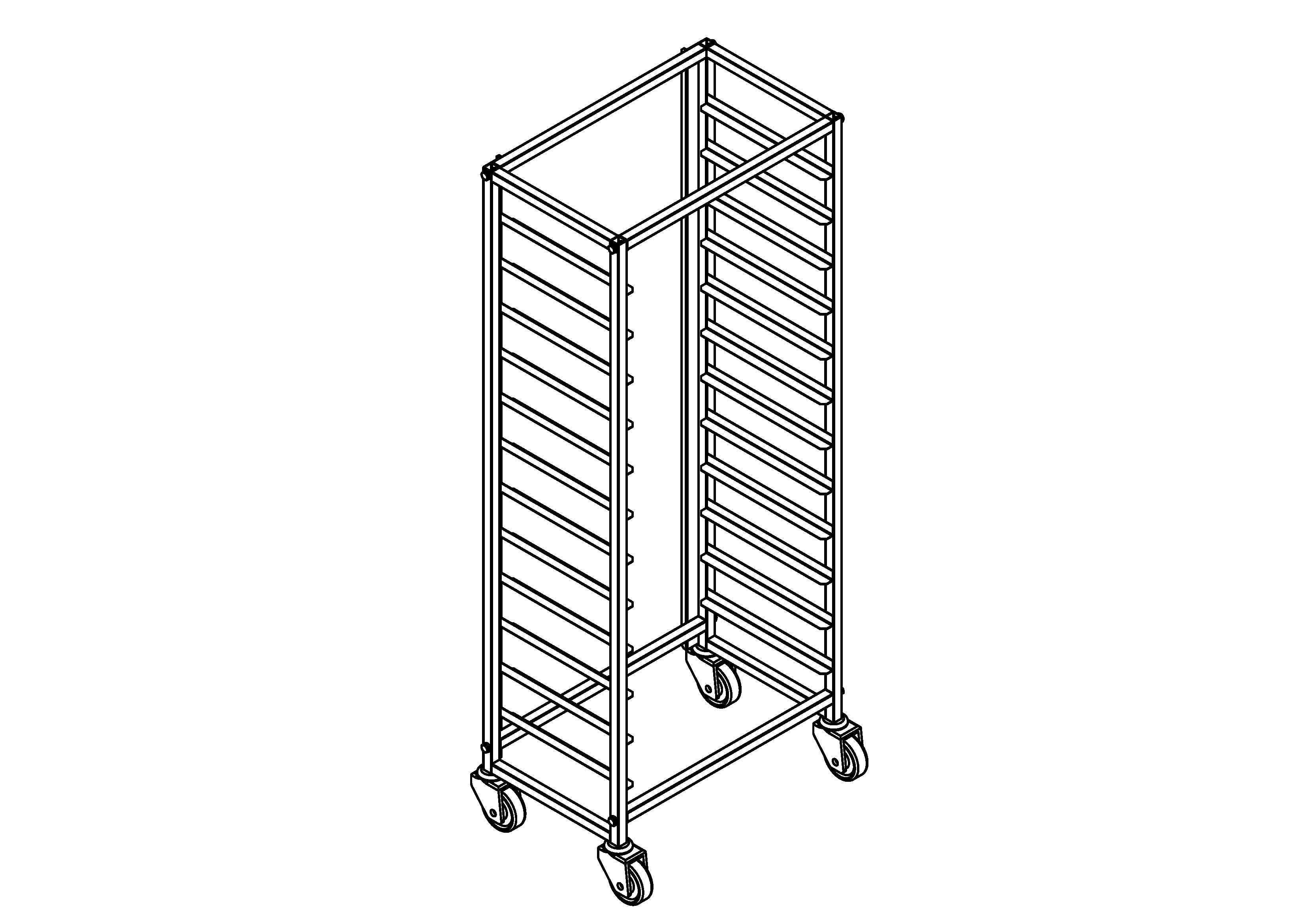 Стеллажи шпильки являются вспомогательным оборудованием и предназначены для использования на предприятиях общественного питания в холодных, горячих цехах и других производственных помещениях в качестве межоперационного средства. Стеллаж-шпилька имеет разборную конструкцию, каркас выполнен из нерж. профильной трубы 25х25 марки AISI 430. Имеет 12 направляющих для противня 400х600 (с загрузкой противня по стороне 400 мм), выполненных из нерж. стали марки AISI 430, толщиной 1,2 мм. Стеллаж-шпилька имеет колеса ф100 мм (2 колеса с тормозом, 2 без тормоза).