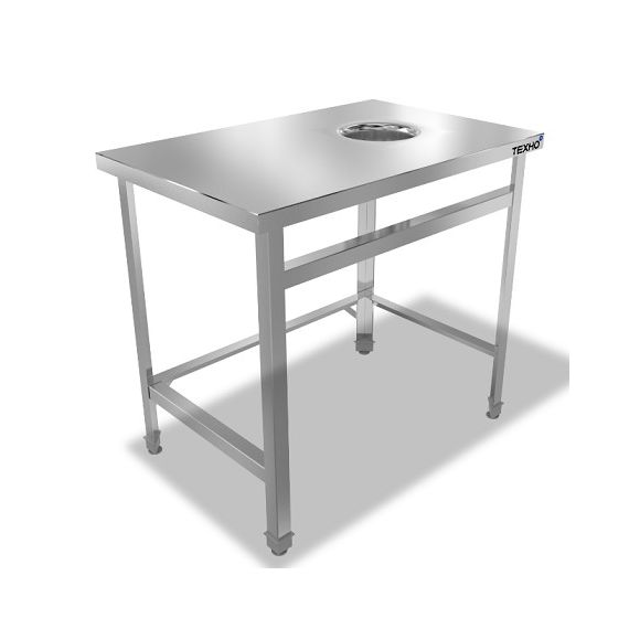 900х600х850мм, Стол для сбора отходов без борта, столешница из нержавеющей стали марки AISI 430 толщиной 0,8мм. Каркас разборный из уголка 40х40 толщиной 2мм, покрытого порошковой краской серого цвета. Отверстие O180мм слева. Регулируемые опоры. Стол поставляется в разобранном виде.