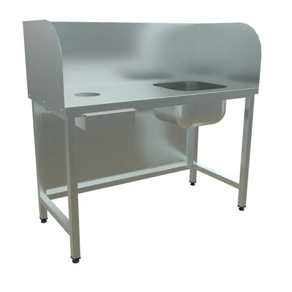 1300х700х870 Стол для чистки рыбы (столешница – нерж. сталь aisi 430, усиление ОСП, отв. Диаметром 150мм, выдвижной ящик под отходы, емкость 400х400х250мм, либо 500х500х300мм нерж. сталь. aisi 304, съемный борт 400мм с 3-х сторон, каркас каркас нерж. труба 40х40, сифон)
