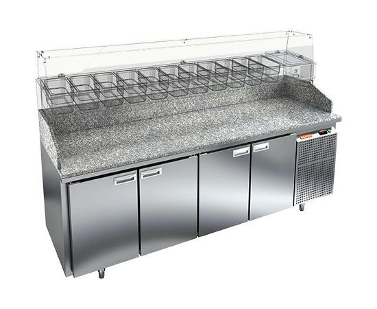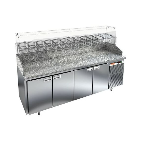 2280х700х1050мм, PZ3-1111/GN КАМЕНЬ стол для пиццы охл.(+2+10), 4 двери, с бортом с 3х сторон, 2280х700х1050мм