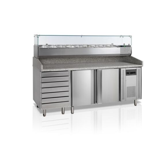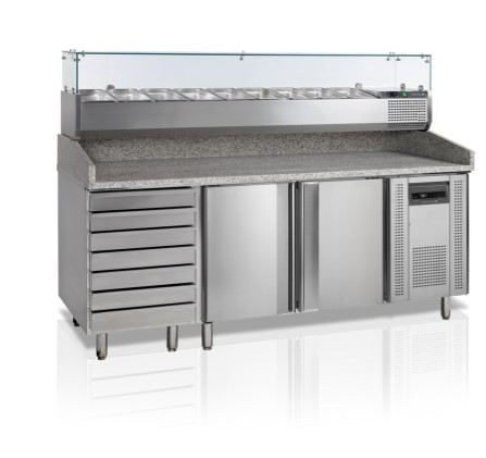 , 2045х800х1445мм, 0,3кВт, 220В, +2/+10С, брутто/нетто - 390/370л, 393кг, с встр.агр. R600a, 2 двери +7 ящиков, нерж.сталь, направляющие под 7 противней для пиццы в каждом отсеке (400x600мм), гранитная столешница, вентилируемое охлаждение, автооттайка, регулируемые ножки. В комплекте с верхней витриной для топпингов VK38-200