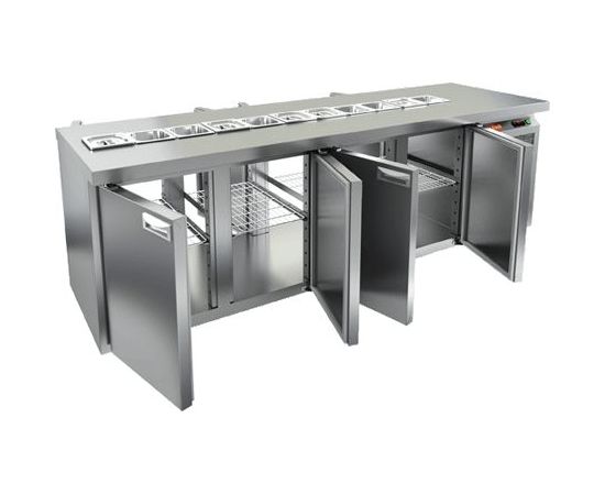 2280х700х850мм, SL2T-1111/GN (1/6) БЕЗ КРЫШКИ стол охл.(+2+10), 4 секции, по 4 двери с 2х сторон, 2280х700х850мм