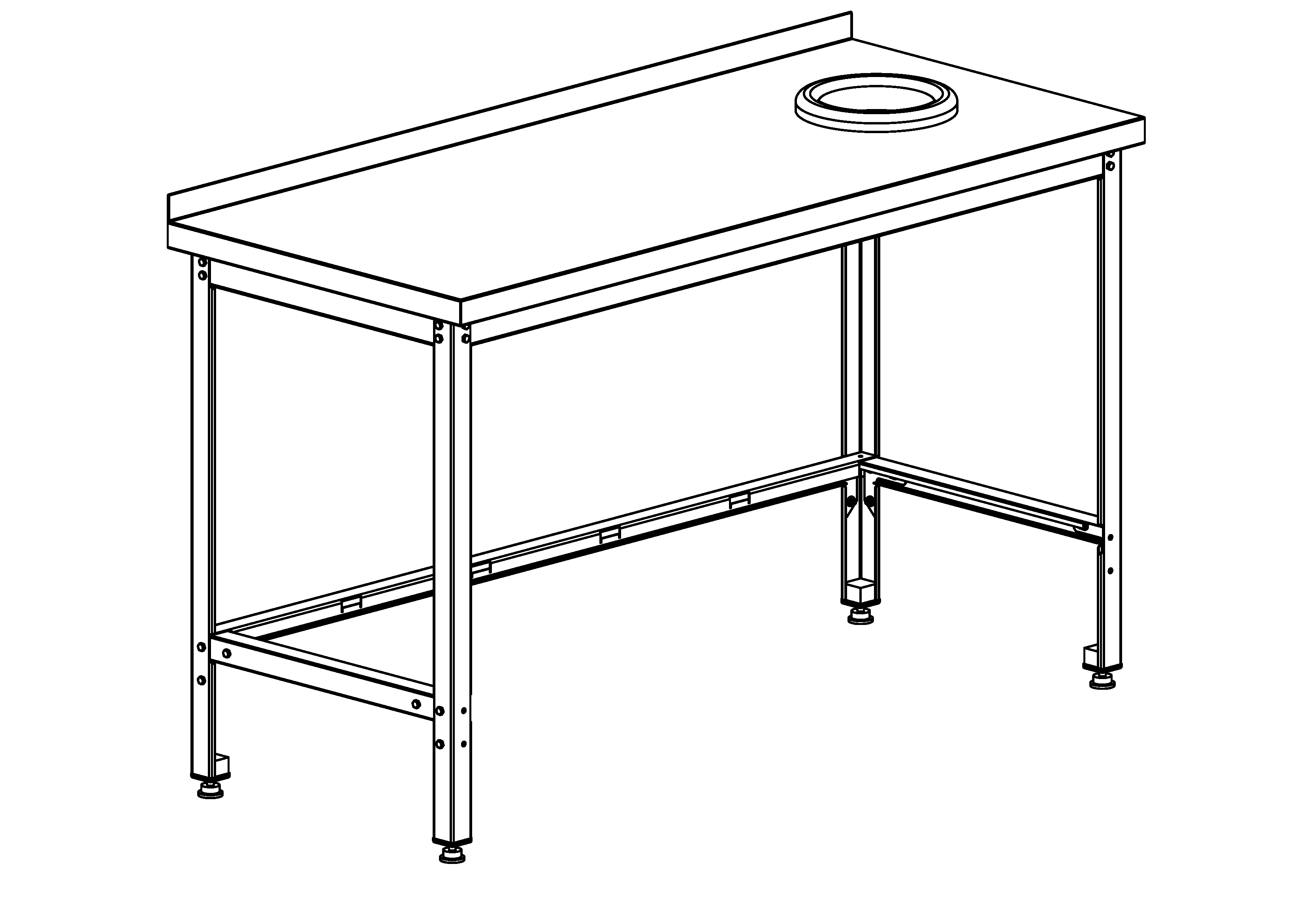 Серия СПН3: стол для сбора отходов имеет разборную конструкцию, каркас выполнен из профильных элементов нерж. стали марки AISI 430 толщиной 1,2 мм. Столешница с бортом выполнена из нерж. стали марки AISI 430 толщиной 0,8 мм и усилена подложкой из ДСП толщиной 16 мм. В столешнице имеет отверстие для сбора отходов диаметром 200 мм. Столешница имеет задний борт (пристенный тип). Вместо полки выполнена обвязка с 3х сторон. Стол оснащен регулируемыми по высоте опорами.