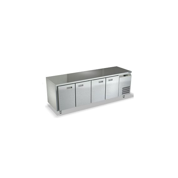 2280х600х850мм, Охлаждаемый стол без борта, боковое расположение агрегата. Столешница и корпус из нержавеющей стали марки AISI 430. Задняя панель и дно из оцинкованной стали. 4 двери. Температурный режим -2...+10, напряжение 220В, мощность 480Вт, внутренний объем стола 570л, полезный объем стола 444л. Компрессор (Испания). Хладон R-134. Петля доводчик (Польша). Полка решетка регулируемая по высоте с шагом - 45мм, гастронормированная, нагрузка 35кг. Нога опорная круглая, регулировка 50мм (Италия). Поставляется в собранном виде.