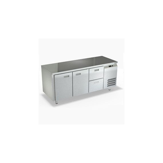 1835х600х850мм, Охлаждаемый стол без борта, боковое расположение агрегата. Столешница и корпус из нержавеющей стали марки AISI 430. Задняя панель и дно из оцинкованной стали. 2 двери, 2 ящика гастронормированных нагрузка по 35кг на ящик, направляющие с доводчиками (Австрия). Температурный режим -2...+10, напряжение 220В, мощность 460Вт, внутренний объем стола 420л, полезный объем стола 277л. Компрессор (Испания). Хладон R-134. Петля доводчик (Польша). Полка решетка регулируемая по высоте с шагом - 45мм, гастронормированная, нагрузка 35кг. Нога опорная круглая, регулировка 50мм (Италия). Поставляется в собранном виде.