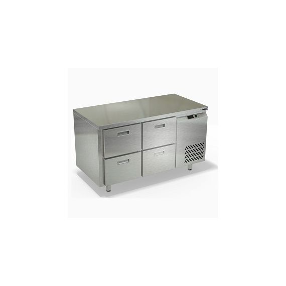 1390х600х850мм, Охлаждаемый стол без борта, боковое расположение агрегата. Столешница и корпус из нержавеющей стали марки AISI 430. Задняя панель и дно из оцинкованной стали. 4 ящика гастронормированных нагрузка по 35кг на ящик, направляющие с доводчиками (Австрия). Температурный режим -2...+10, напряжение 220В, мощность 220Вт, внутренний объем стола 224л, полезный объем стола 110л. Компрессор (Испания). Хладон R-134. Нога опорная круглая, регулировка 50мм (Италия). Поставляется в собранном виде.