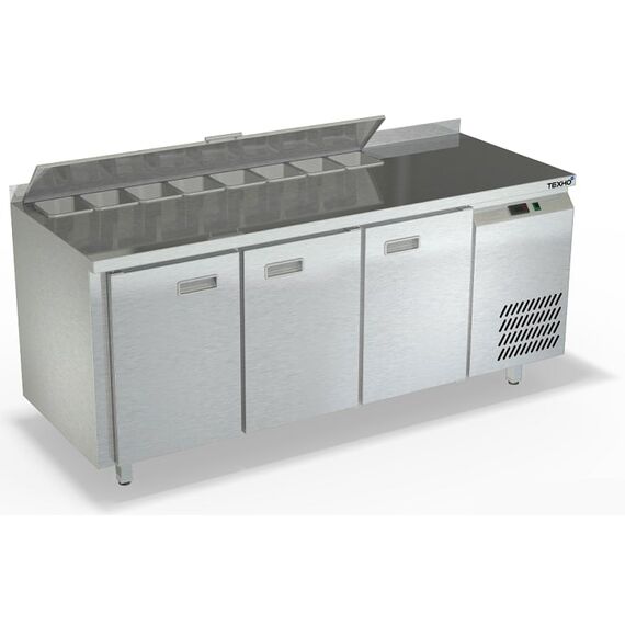 1835х700х850мм, Охлаждаемый стол с бортом высотой 50мм для салатов, с крышкой, боковое расположение агрегата. Столешница и корпус из нержавеющей стали марки AISI 430. Задняя панель и дно из оцинкованной стали. 3 двери. Температурный режим +2...+10, напряжение 220, мощность 460Вт, внутренний объем стола 505л, в зону под гастроёмкости помещается 7 GN 1/6 глубиной 100мм, полезный объём стола 366л. Компрессор (Испания). Хладон R-134. Петля доводчик (Польша). Полка решетка регулируемая по высоте с шагом - 45мм, гастронормированная, нагрузка 35кг. Нога опорная круглая, регулировка 50мм (Италия). Поставляется в собранном виде.