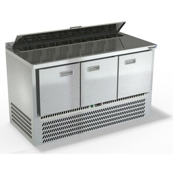 1485х700х850мм, Охлаждаемый стол с бортом высотой 50мм для салатов, с крышкой, нижнее расположение агрегата. Столешница и корпус из нержавеющей стали марки AISI 430. Задняя панель и дно из оцинкованной стали. 3 двери. Температурный режим +2...+10, напряжение 220В, мощность 220Вт, внутренний объем стола 340л, в зону под гастроёмкости помещается 7 GN 1/6 глубиной 150мм, полезный объём стола 210л. Компрессор (Испания). Хладон R-134. Петля доводчик (Польша). Полка решетка регулируемая по высоте с шагом - 45мм, гастронормированная, нагрузка 35кг. Нога опорная, регулировка 25мм. Поставляется в собранном виде.