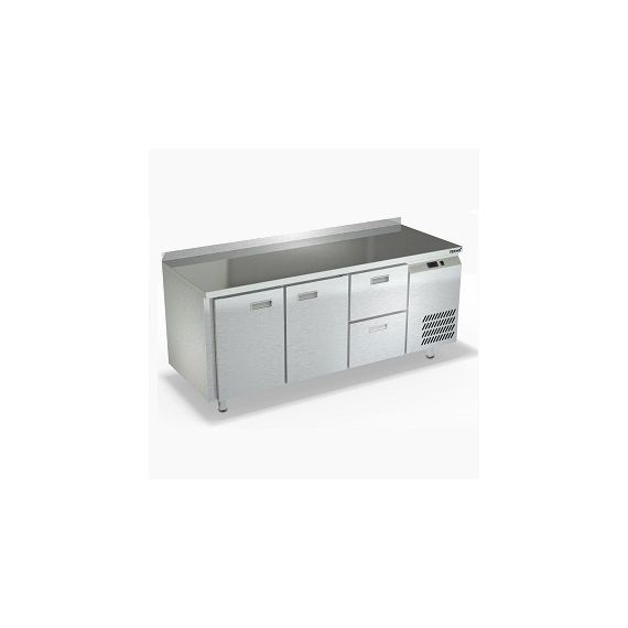 1835х700х850мм, Охлаждаемый стол с бортом высотой 50мм, боковое расположение агрегата. Столешница и корпус из нержавеющей стали марки AISI 430. Задняя панель и дно из оцинкованной стали. 2 двери, 2 ящика гастронормированных нагрузка по 35кг на ящик, направляющие с доводчиками (Австрия). Температурный режим -2...+10, напряжение 220В, мощность 460Вт, внутренний объем стола 505л, полезный объем стола 309л. Компрессор (Испания). Хладон R-134. Петля доводчик (Польша). Полка решетка регулируемая по высоте с шагом - 45мм, гастронормированная, нагрузка 35кг. Нога опорная круглая, регулировка 50мм (Италия). Поставляется в собранном виде.