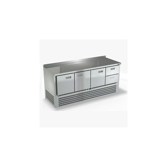 1970х600х850мм, Охлаждаемый стол с бортом высотой 50мм, нижнее расположение агрегата. Столешница и корпус из нержавеющей стали марки AISI 430. Задняя панель и дно из оцинкованной стали. 3 двери, 2 ящика гастронормированных нагрузка по 35кг, направляющие с доводчиками (Австрия). Температурный режим -2...+10, напряжение 220В, мощность 460Вт, внутренний объем стола 410л, полезный объем стола 202л. Компрессор (Испания). Хладон R-134. Петля доводчик (Польша). Полка решетка регулируемая по высоте с шагом - 45мм, гастронормированная, нагрузка 35кг. Нога опорная, регулировка 25мм. Поставляется в собранном виде.
