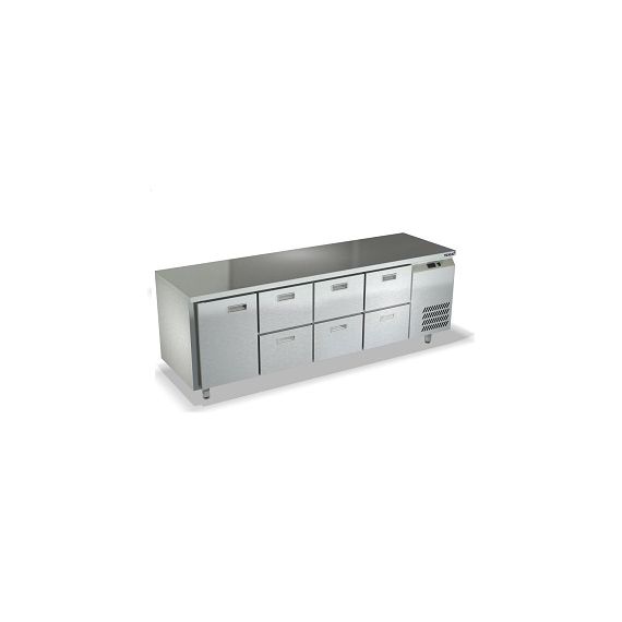 2280х700х850мм, Морозильный стол без борта, боковое расположение агрегата. Столешница и корпус из нержавеющей стали марки AISI 430. Задняя панель и дно из оцинкованной стали. 1 дверь, 6 ящиков гастронормированных нагрузка по 35кг на ящик, направляющие с доводчиками (Австрия). Температурный режим -10...-18, напряжение 220В, мощность 480Вт, внутренний объем стола 660л, полезный объем стола 317л. Компрессор (Испания). Хладон R404. Петля доводчик (Польша). Полка решетка регулируемая по высоте с шагом - 45мм, гастронормированная, нагрузка 35кг. Нога опорная круглая, регулировка 50мм (Италия). Поставляется в собранном виде.