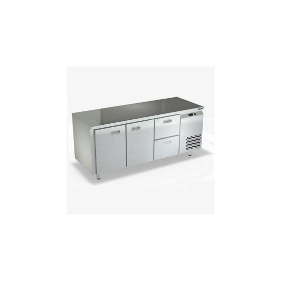 1835х700х850мм, Морозильный стол без борта, боковое расположение агрегата. Столешница и корпус из нержавеющей стали марки AISI 430. Задняя панель и дно из оцинкованной стали. 2 двери, 2 ящика гастронормированных нагрузка по 35кг на ящик, направляющие с доводчиками (Австрия). Температурный режим -10...-18, напряжение 220В, мощность 460Вт, внутренний объем стола 505л, полезный объем стола 309л. Компрессор (Испания). Хладон R404. Петля доводчик (Польша). Полка решетка регулируемая по высоте с шагом - 45мм, гастронормированная, нагрузка 35кг. Нога опорная круглая, регулировка 50мм (Италия). Поставляется в собранном виде.