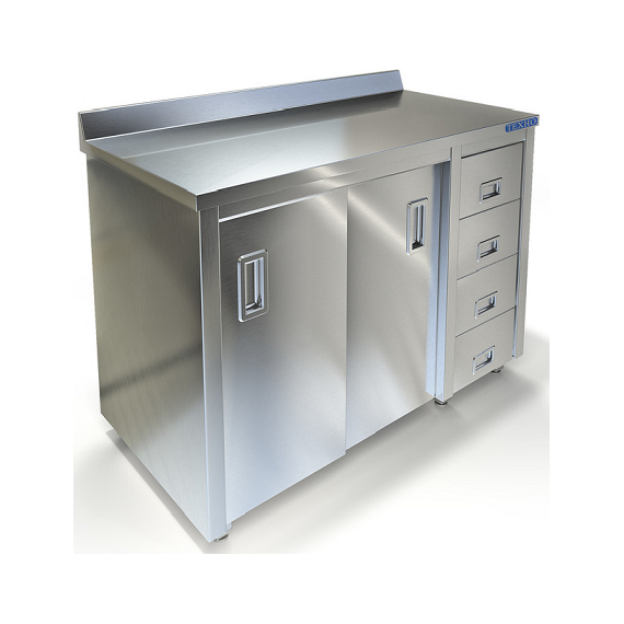 1800х800х850мм, Стол-тумба с бортом высотой 70мм. Столешница из нержавеющей стали марки AISI 304 толщиной 0,8мм, ЛДСП толщиной 32 мм. Корпус, две двери-купе и четыре выдвижных ящика из нержавеющей стали марки AISI 304 толщиной 0,8мм расположенных справа. Полка из нержавеющей стали марки AISI 430 толщиной 0,8мм. Задняя стенка из оцинкованной стали толщиной 0,55мм. Регулируемые опоры. Стол поставляется в собранном виде.
