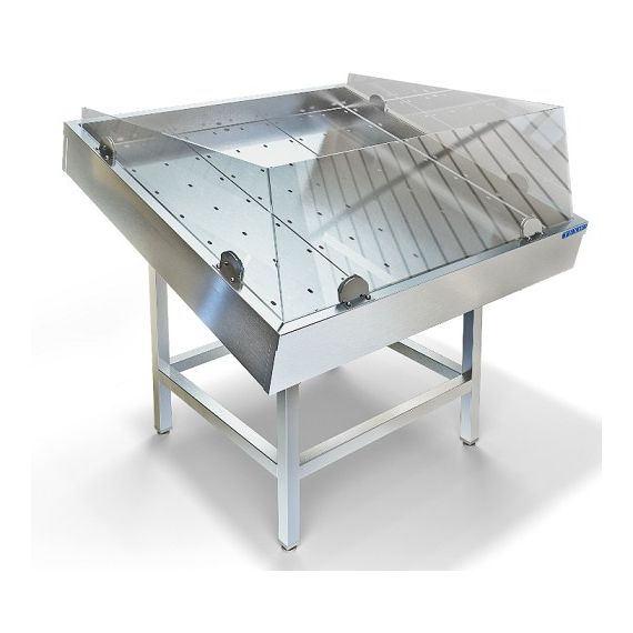 1100х1100х1030мм, Стол для выкладки рыбы на льду без агрегата под выносной холод, ванна из нержавеющей стали марки AISI 304 толщиной 1,0 мм. Панели обшивки из нержавеющей стали марки AISI 430 толщиной 0,8мм. Сливные трубки диаметром 20 мм 2шт. Внутри ванны перфорированный поддон из нержавеющей стали марки AISI 430 толщиной 0,8мм для аккумулирования холода. Подставка разборная из трубы 40х40 нержавеющей стали марки AISI 304. Регулируемые опоры. Стол поставляется в разобранном виде.