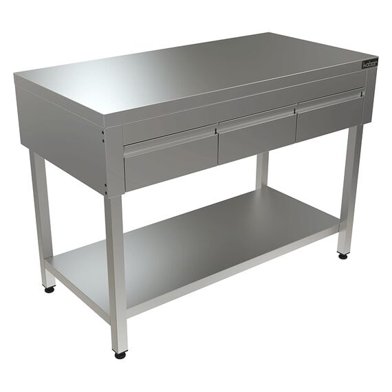 1500х600х870мм, Стол с выдвижными ящиками (столешница – нерж. сталь aisi 430, выдвижные ящики под столешницей, усиление ЛДСП, каркас нерж. труба 40х40, полка, разборный)