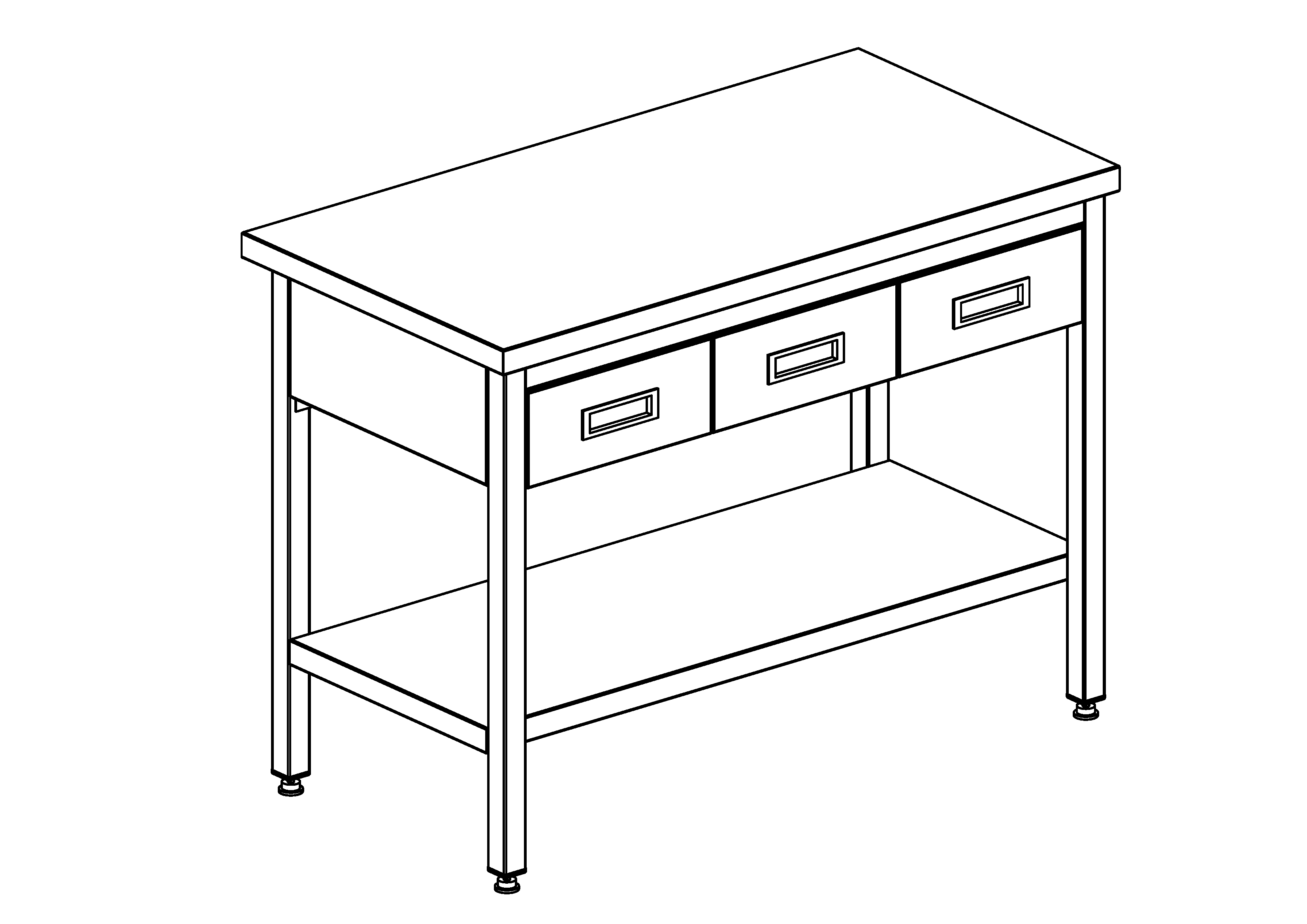 Серия СПОНЯ: стол с полновыкатными ящиками (3 ящика) имеет разборную конструкцию, каркас и полновыкатные ящики выполнены из профильных элементов нерж. стали марки AISI 430 толщиной 1,2 мм, ножки из нерж. трубы 40х40 марки AISI 430. Столешница выполнена из нерж. стали марки AISI толщиной 0,8 мм и усилена подложкой из ДСП толщиной 16 мм. Полка выполнена из нерж. стали марки AISI 430 толщиной 0,8 мм. Стол оснащен регулируемыми по высоте опорами.
