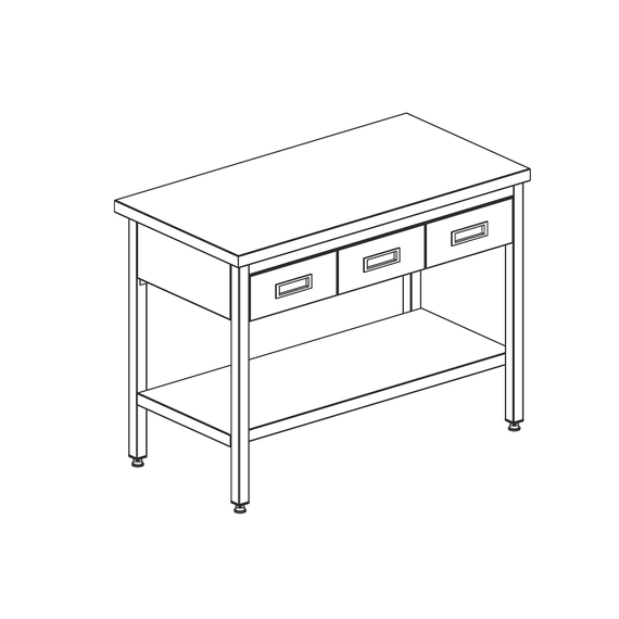 Стол с ящиками СПОНЯ2 115/60, 3 ящика, без борта, полка сплошная, каркас уголок, ножки труба 40х40 - нерж., 1150х600х860