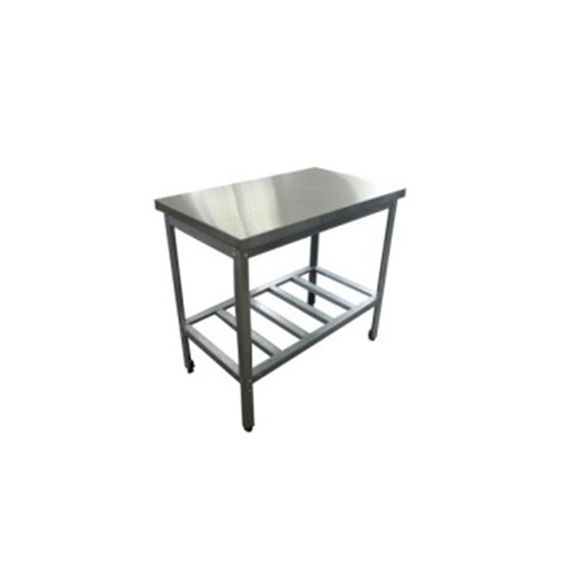 а также в качестве вспомогательной поверхности для кухонного оборудования: разборная конструкция, какркас выполнен из профильных элементов оцинкованной. стали толщиной 0,8 и 1,5 мм. Столешница выполнена из нерж. стали марки AISI 430 толщиной 0,6 мм и усилена подложкой из ДСП толщиной 16мм. Полка решетчатая. Стол оснащен регулируемыми по высоте опорами. Габариты: 1500*800*860.