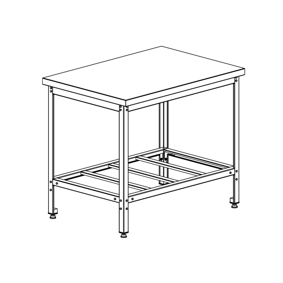 Серия СПОН3 разборная конструкция, каркас выполнен из профильных элементов нерж. стали марки AISI 430 толщиной 1,2 мм. Столешница выполнена из нерж. стали марки AISI 430 толщиной 0,8 мм и усилена подложкой из ДСП толщиной 16 мм. Полка решетчатая. Стол оснащен ругулируемыми по высоте опорами.
