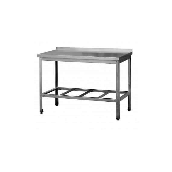 а также в качестве вспомогательной поверхности для кухонного оборудования: разборная конструкция, какркас выполнен из профильных элементов оцинкованной. стали толщиной 0,8 и 1,5 мм. Столешница выполнена с бортом (пристенного типа) из нерж. стали марки AISI 430 толщиной 0,6 мм и усилена подложкой из ДСП толщиной 16мм. Полка решетчатая. Стол оснащен регулируемыми по высоте опорами. Габариты: 800*700*860.