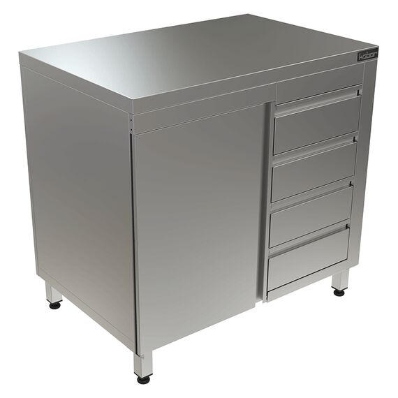 900х700х870мм, Стол-тумба (столешница - нерж. сталь. aisi 430, усиление ЛДСП, каркас разборный из нерж. стали 430, распашные двери, 4 выдвижных ящика, полка), Ящики могут устанавливаться слева либо справа
