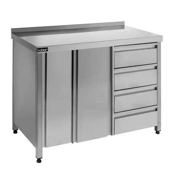 1500х700х870мм, Стол-тумба с бортом (столешница - нерж. сталь. aisi 430, усиление ЛДСП, каркас разборный из нерж. стали 430, двери-купе, 4 выдвижных ящика, полка), Ящики могут устанавливаться слева либо справа