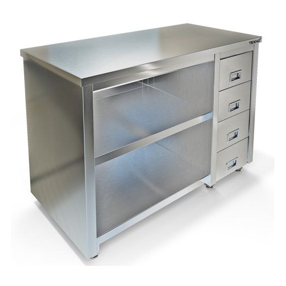 1900х800х850мм, Стол-тумба без дверей без борта. Столешница из нержавеющей стали марки AISI 304 толщиной 0,8мм, ЛДСП толщиной 32 мм. Корпус, полка и четыре выдвижных ящика расположенных справа изготовлены из нержавеющей стали марки AISI 430 толщиной 0,8мм. Задняя стенка из оцинкованной стали толщиной 0,55мм. Регулируемые опоры. Стол поставляется в собранном виде.