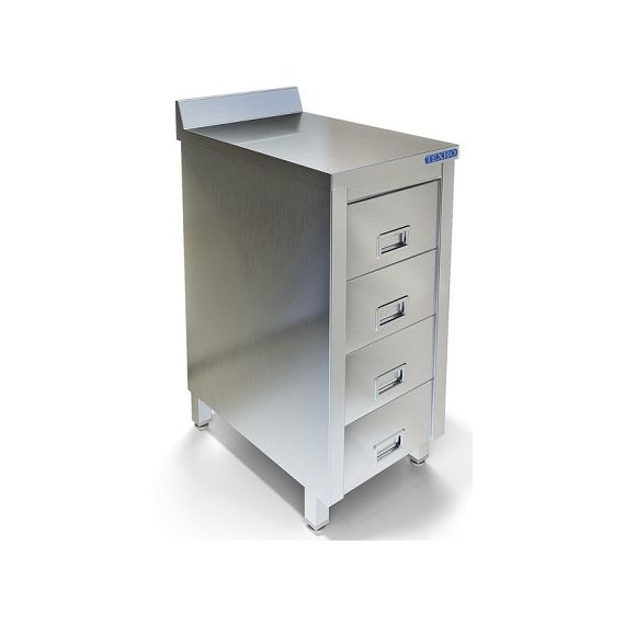 500х600х850мм, Стол-тумба с бортом высотой 70мм. Столешница из нержавеющей стали марки AISI 304 толщиной 0,8мм, ЛДСП толщиной 32 мм. Корпус и четыре выдвижных ящика из нержавеющей стали марки AISI 304 толщиной 0,8мм. Задняя стенка из нержавеющей стали марки AISI 430 толщиной 0,8мм. Регулируемые опоры. Стол поставляется в собранном виде.