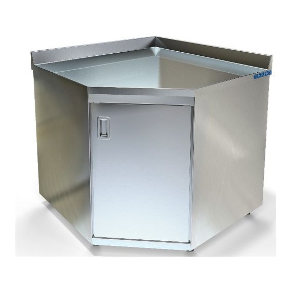 920х920х850мм, Стол-тумба угловой с бортом высотой 70мм, для столов 600 серии. Столешница из нержавеющей стали марки AISI 304 толщиной 0,8мм, ЛДСП толщиной 32 мм. Корпус и распашная дверка из нержавеющей стали марки AISI 304 толщиной 0,8мм. Полка из нержавеющей стали марки AISI 304 толщиной 0,8мм. Задняя стенка из оцинкованной стали толщиной 0,55мм. Регулируемые опоры. Стол поставляется в разобранном виде.