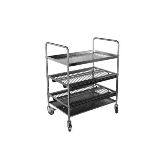 950х625х1180мм, Нерж. сталь - полки, окрашеный профиль - каркас, 2 полки для сушки тарелок + 2 полки для стаканов, лоток для сбора воды, 2 колеса с тормозом. Поставляется в разобранном виде