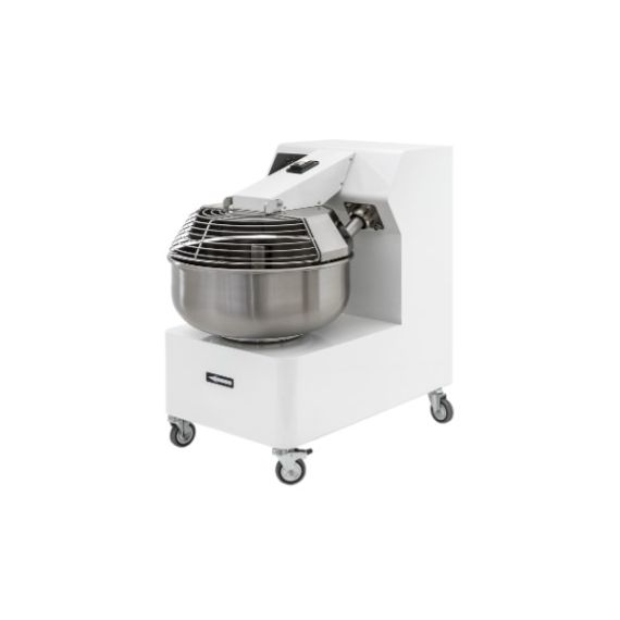 590 x 930 x 875 мм, 1,1-1,5 кВт, 380В, 35кг/40л, вилочный тестомес, несъемн. дежа, 2 скор., таймер, колеса. До 105 кг/час.