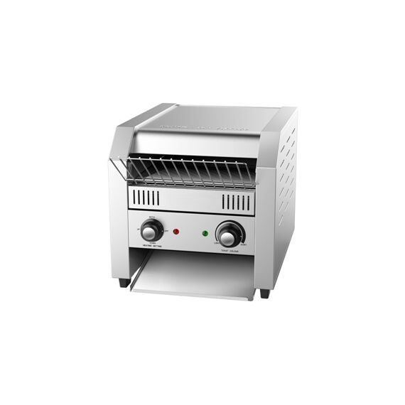 362х502х330мм, 220В, 1.7кВт, 10,25кг, производительность до 360 шт./ч, материал корпуса - нержавеющая сталь, 3 настройки подогрева: сверху, снизу и с обеих сторон, регулировка скорости конвейера, поддон для крошек, размер конвейера 245.5х340мм, макс.высота хлеба 55мм