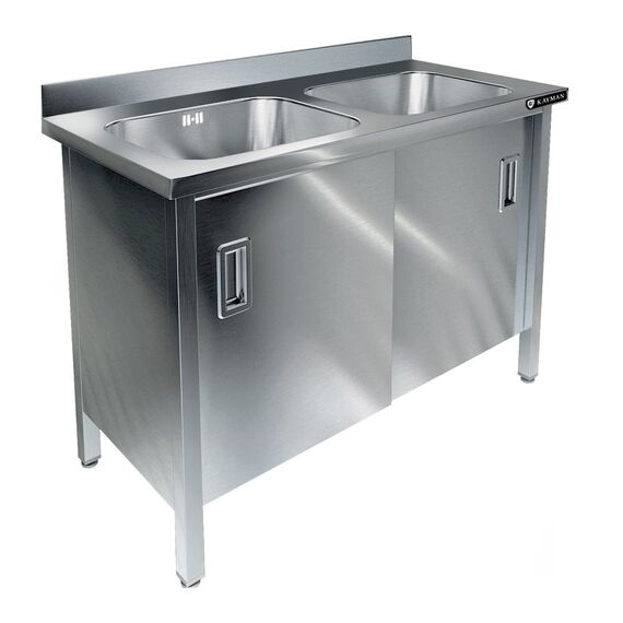 1200х600х850, ванна цельнотянутая из стали AISI 304 (2 емк.)400х400х250, каркас сварной из стали AISI 430, толщина 1,2 мм, рабочая поверхность из нержавеющей стали AISI 304, толщиной 1 мм, борт плоский 70 мм, двери купе.