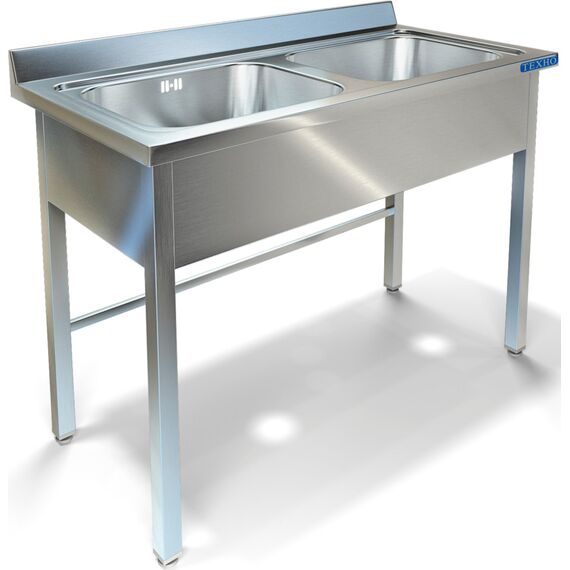 1400х800х850мм, Две цельнотянутые емкости размером 600х600х330 из нержавеющей стали марки AISI 304 толщиной 1мм, обнижение 2 мм. Объемный пристенный борт высотой 70мм. Фартук с 3-х сторон высотой 285 мм. Каркас сварной из трубы 40х40 нержавеющей стали марки AISI 430 толщиной 1,2мм, с тыловой части установлены две перемычки для жесткости. Ванна комплектуется выпуском с нержавеющей решеткой и механическим запорным клапаном, диаметр выпуска 90мм, диаметр подключаемого сифона 50мм, перелив, регулируемые опоры. На дно ванны нанесена виброшумоизоляция. Ванна поставляется в собранном виде.